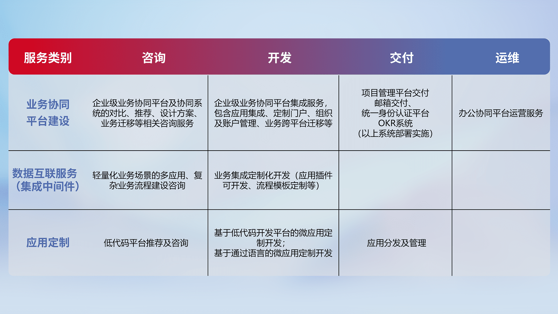 针对钉钉、、、、企微、、IDaas等平台级产品提供产品的规划、、方案、、、、交付、、、定制化开发等服务,,实现如统一协同办公、、智能客户服务、、、混合会议管理、、、智能数据查询、、等业务场景,,,,实现数字化转型。。。。